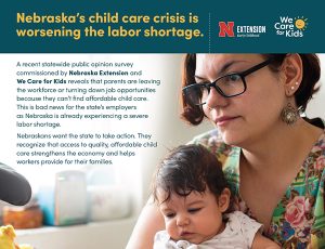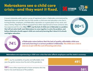Nebraska Extension and We Care for Kids recently commissioned a statewide survey of registered voters in Nebraska to gauge public support for early childhood education in our state. Results show widespread support for child care and early learning, and demonstrate that Nebraskans see a clear link between access to child care, helping workers provide for their families, and keeping businesses strong.