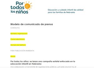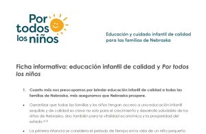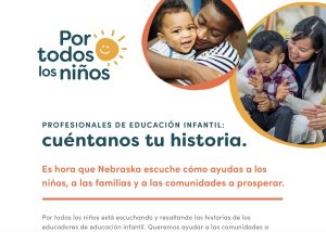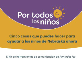 Todos los niños y las familias de Nebraska deben tener acceso a una educación infantil de calidad. Desafortunadamente, muchos no lo tienen. Juntos, podemos resolver este problema y garantizar que los niños, las familias, las comunidades y Nebraska prosperen. Habla con tu familia, tus amigos y los líderes comunitarios sobre la necesidad de la educación y cuidado infantil de calidad para los niños. ¡Ayuda a marcar una diferencia y hazlo por todos los niños!